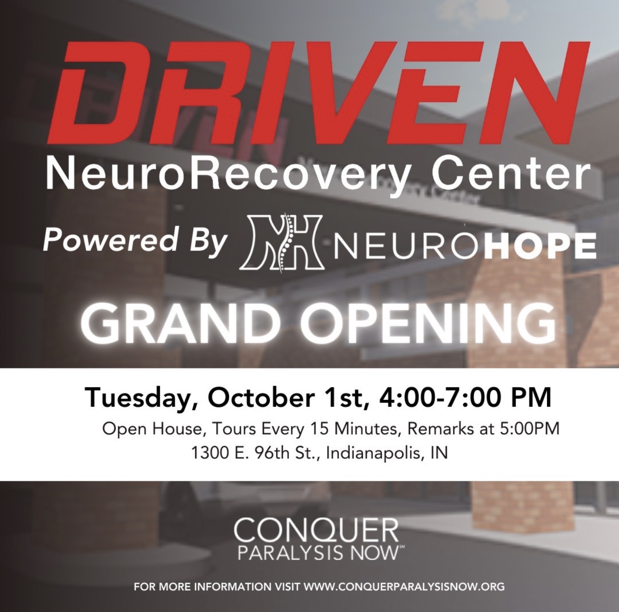 Conquer Paralysis Now (CPN), a nonprofit dedicated to advancing spinal cord injury research and treatment, celebrated a significant milestone with the grand opening of its new headquarters in Indianapolis, which also houses its DRIVEN NeuroRecovery Center powered by NeuroHope.